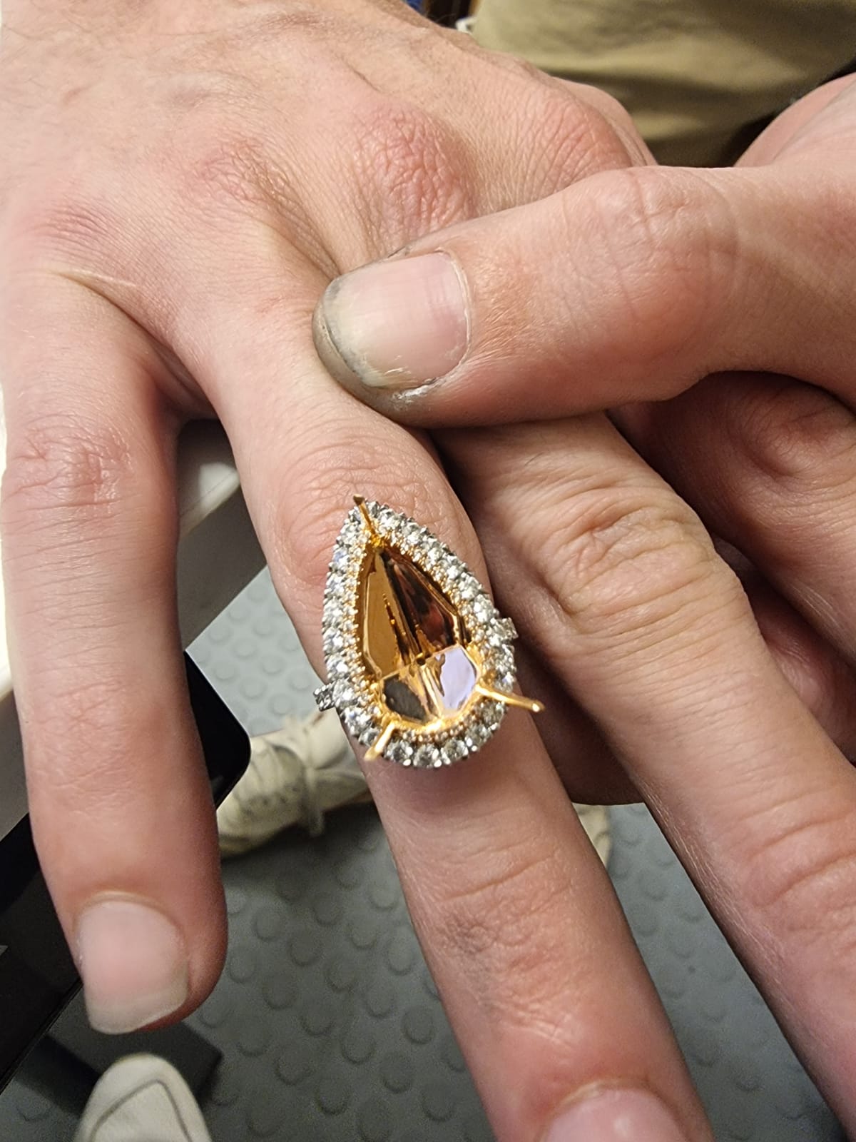 After the individual pieces are 3D printed and cast, our team of jewellers began the process of assembly before setting both the centre stone and applying the pave effect to the mount. Each element of the precious metal mount has been designed to showcase the diamond (such as the thinner band) and is hand assembled to ensure the highest quality and design. A pave/channel setting was created to both help create the illusion of larger center stone and draw the gaze towards the magnificent gem. In a pavé setting, small diamonds line the band and are held in place using small prongs. In a channel setting, a small channel is cut into the ring, with diamonds set in a row inside the channel.